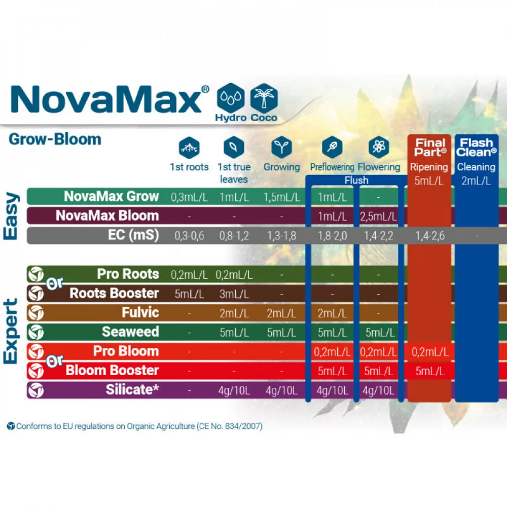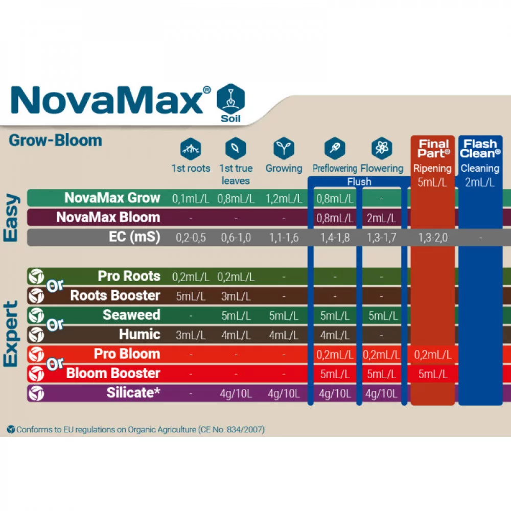 ** Note: - Remember that Nova Max must be thoroughly shaken before use (the concentration is very high). Use measuring containers to measure the right amount of fertilizer, do not immerse syringes as the more liquid part is drawn out first, leaving a thick residue. Don't forget that Flora Nova Max Grow is required for vegetation: it works as a specialized nutrient for rapid growth during the vegetative growth phase. Nova Max will always provide the plant with the elements it needs from the emergence of small sprouts to the development of a powerful stem and foliage.