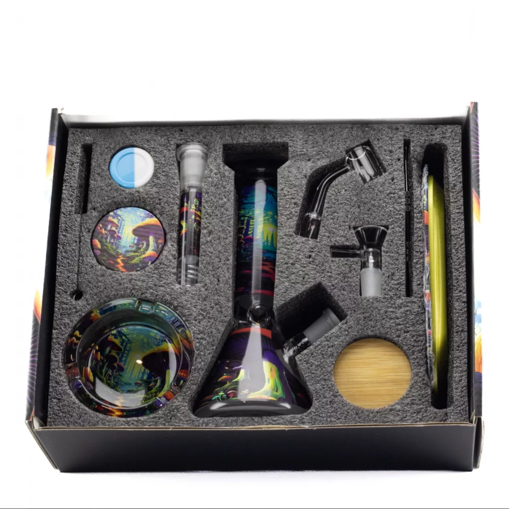 At the heart of the set is a classic 20 cm Beaker-type bong made of durable 5 mm thick borosilicate glass.
