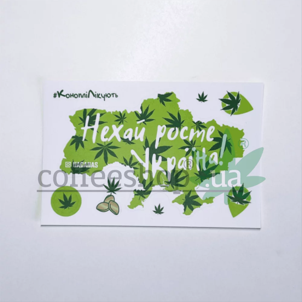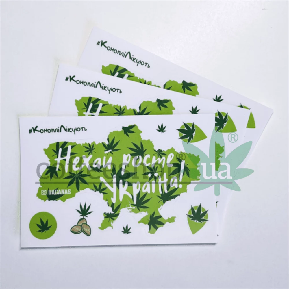 Set of stickers "Let Ukraine grow!" consists of a large sticker of a geographically accurate contour of Ukraine in light green color with interspersed dark green hemp leaves with the inscription "Let Ukraine grow!" and uacanas and 7 more multi-purpose greenish coated stickers. Stickers are printed and cut on modern high-precision equipment using laser technology. The stickers are extremely easy to remove from the base and stick surprisingly well and firmly to various surfaces. Dimensions: length - 90 mm, width - 135 mm.