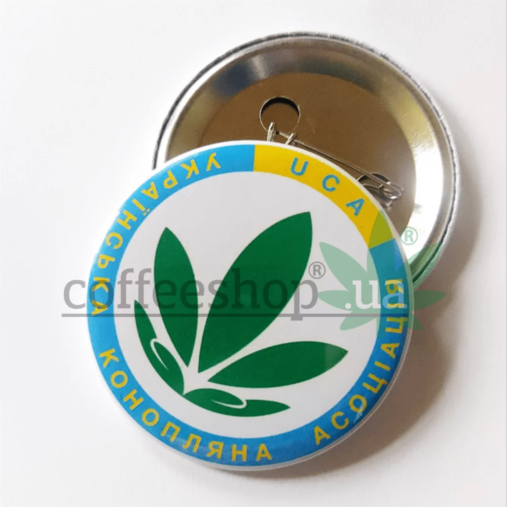 Round badge "Ukrainian Hemp Association" with a protective coating of a transparent film on a metal base in the form of a logo of a public organization on a white background. A stylized green hemp leaf has a soothing "lotus pose" and is placed in the center of a yellow and blue rim. In a circle in gold letters on a blue background is the community's own name, and on a yellow background in blue letters is the abbreviation (UCA). With the help of a pin fastener, the badge is easily attached to various materials. Dimensions: diameter - 56 mm, thickness - 3 mm (without fastening).