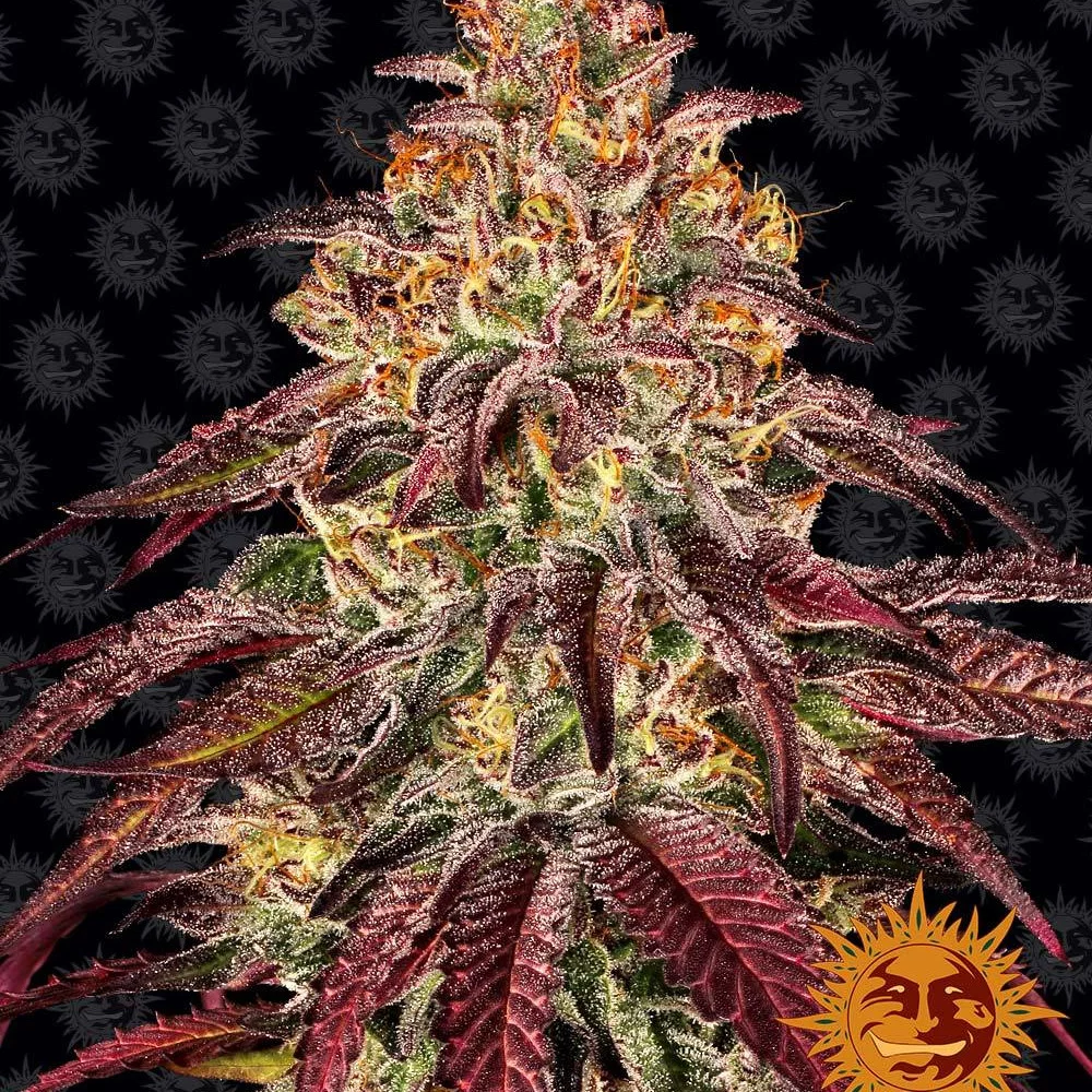 The feminised version of this plant is striking and beautiful, with deep gradients of purple and contrasting dark olive greens. It has a sensational citrus-like, tangerine-candy sweet aroma due to the beta-caryophyllene, linalool and limonene terpenes.
