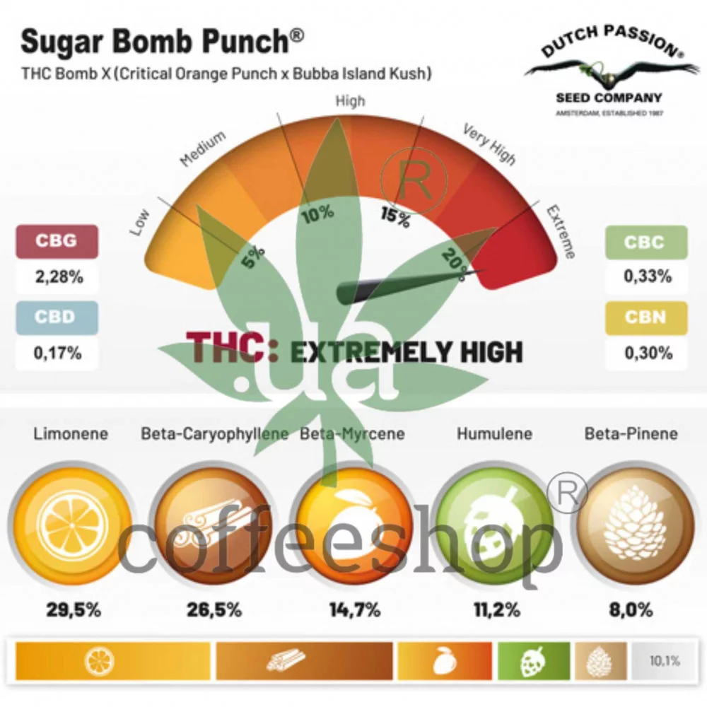Sugar Bomb Punch Feminised by Dutch Passion is a feminized photoperiod strain with indica dominance, created by crossing THC Bomb, Critical Orange Punch, and Bubba Island Kush. This hybrid blends the best traits of its parents, offering a powerful effect, high yield, and rich aroma.