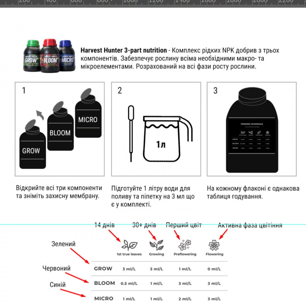 В комплекте есть мерная пипетка которой легко отмерить необходимое количество каждого нутриента согласно таблице, указанной на каждом флаконе.