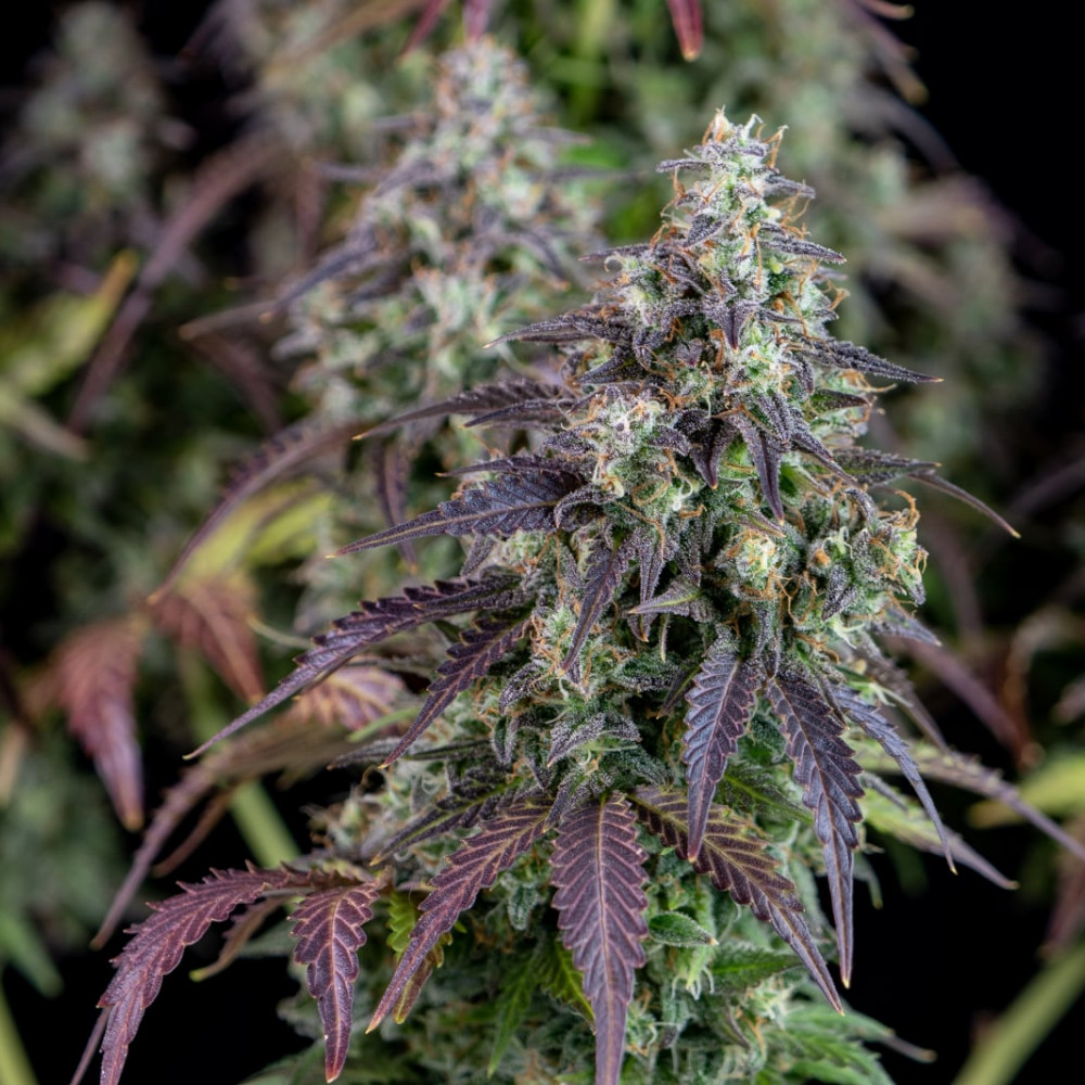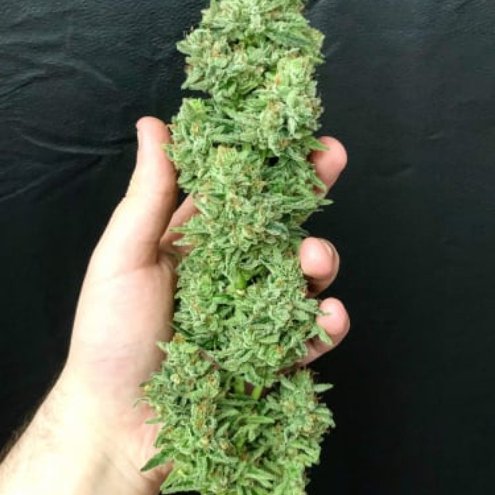 Бутоны буквально утопают в смоле — густой слой трихом покрывает почти всю поверхность соцветий, из-за чего иногда сложно разглядеть чашечки под светло-оранжевыми и белыми пестиками. Такая смолистость делает сорт особенно привлекательным для производства экстрактов и концентратов.