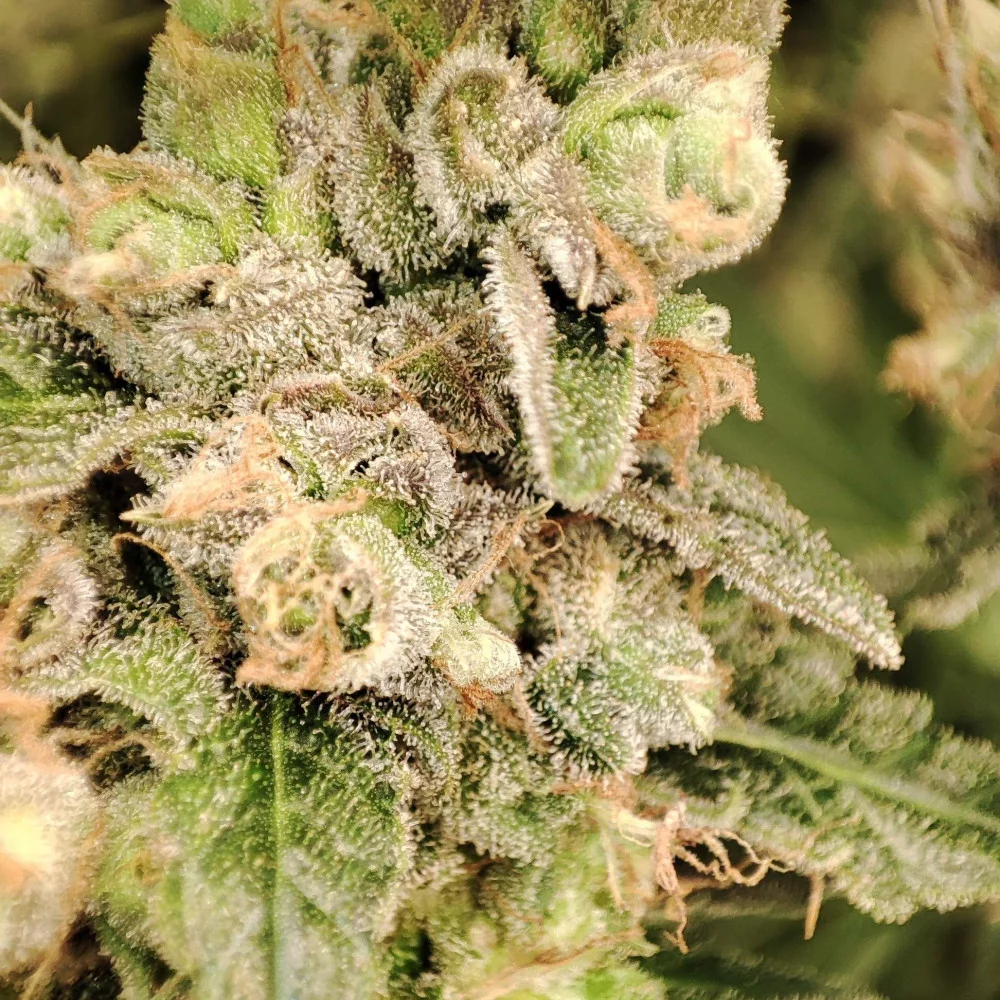 Бутоны этого супербыстрого феминизированного фотопериодического сорта светло-зеленые, почти неоновые на вид. К моменту сбора урожая они покрываются трихомами, придающими им пушистый серебристо-белый вид.